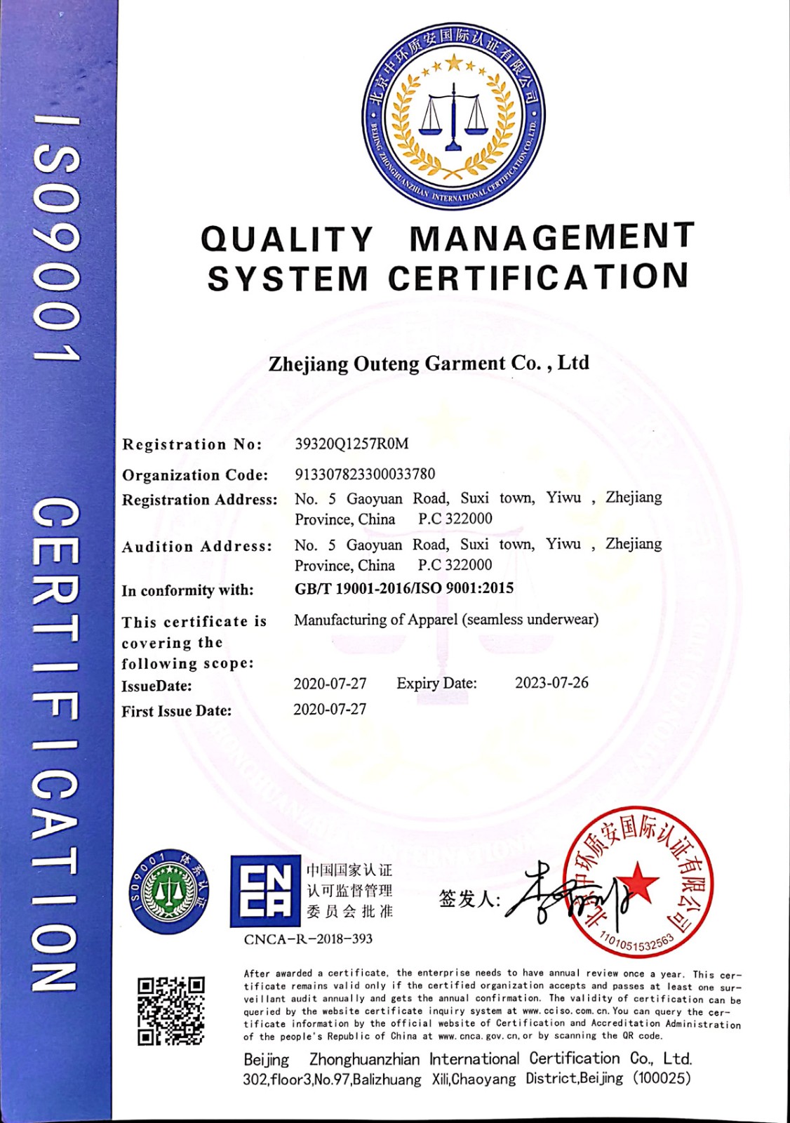 欧腾服饰每年投入近百万资金打样开发新产品,有着一支高素质设计、技术员工队伍。工厂先后通过了ISO 9001质量管理体系认证、BSCI认证、GRS认证、OEKO-TEX国际生态纺织品认证等多项专利检测报告。可提供OEM&ODM服务。欧腾服饰以一套完整、科学的质量管理体系,生产的服装从原材料纱线到成衣,质量完全能够满足国内、国际质量要求。获得了客户一致好评。工厂先后获得省科技型企业、国家高新企业、义乌市诚信讲信用单位、规上企业、信用AAA级等荣誉。
